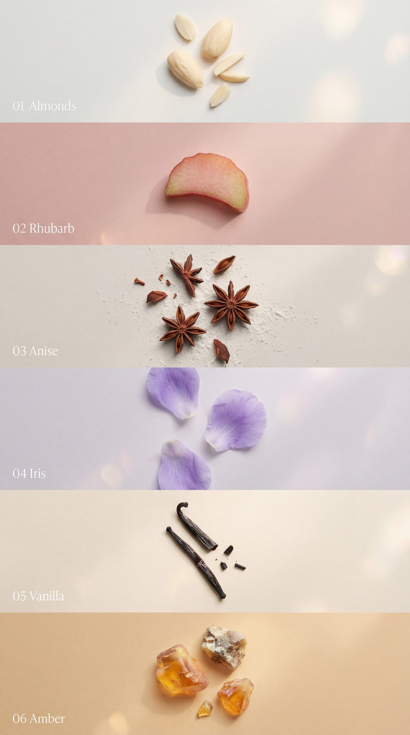 Carousel drifts like sugared tulle in the breeze—airy, nostalgic, and softly sweet. Bitter almond and vanilla melt together into a delicate marzipan cream, while anise offers a mischievous glint, sharpening the edges just enough to intrigue. A trace of rhubarb and iris adds pastel brightness, giving the scent its spun-sugar clarity. It wears like a powdered confection remembered from childhood—delicate, dreamy, and quietly joyful, as if caught inside a porcelain music box that never stops turning.