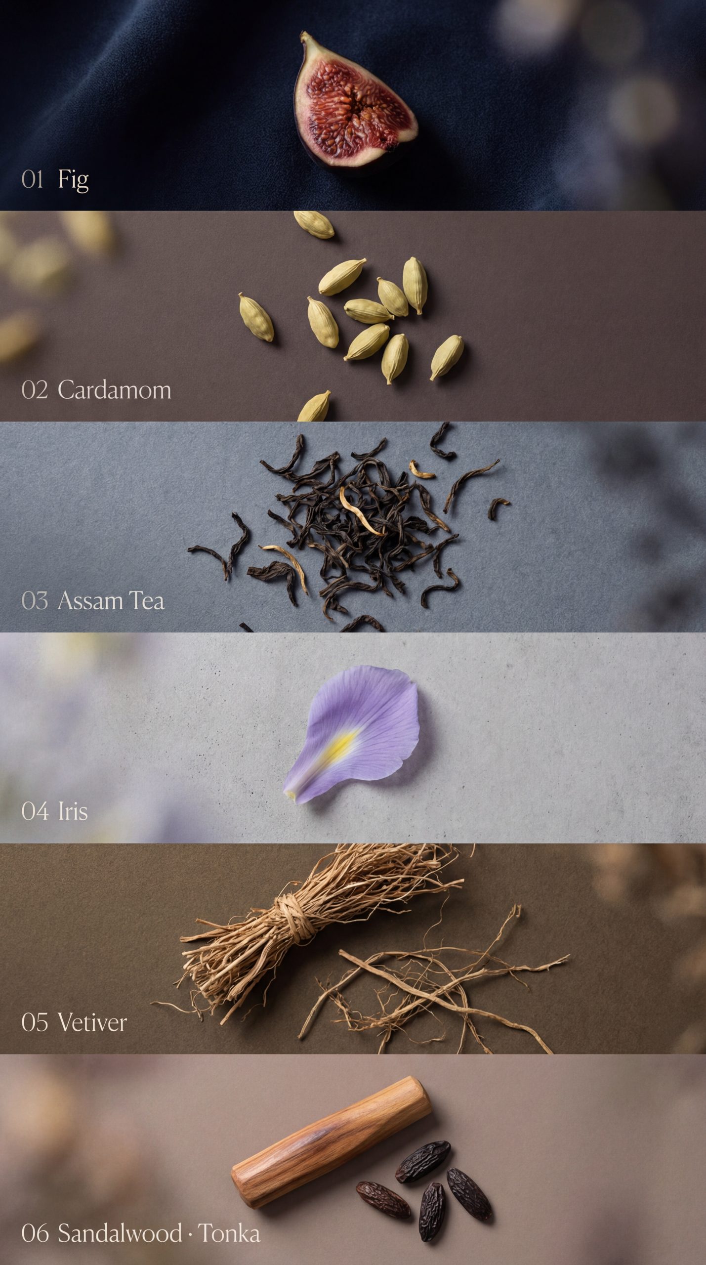 Fig, Cardamom, Assam Tea, Iris, Vetiver, Sandalwood, Tonka