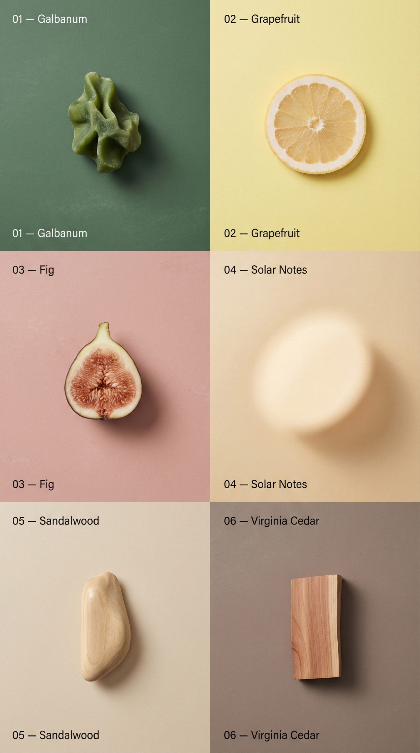 Galbanum, grapefruit, fig, solar notes, sandalwood, Virginia cedar